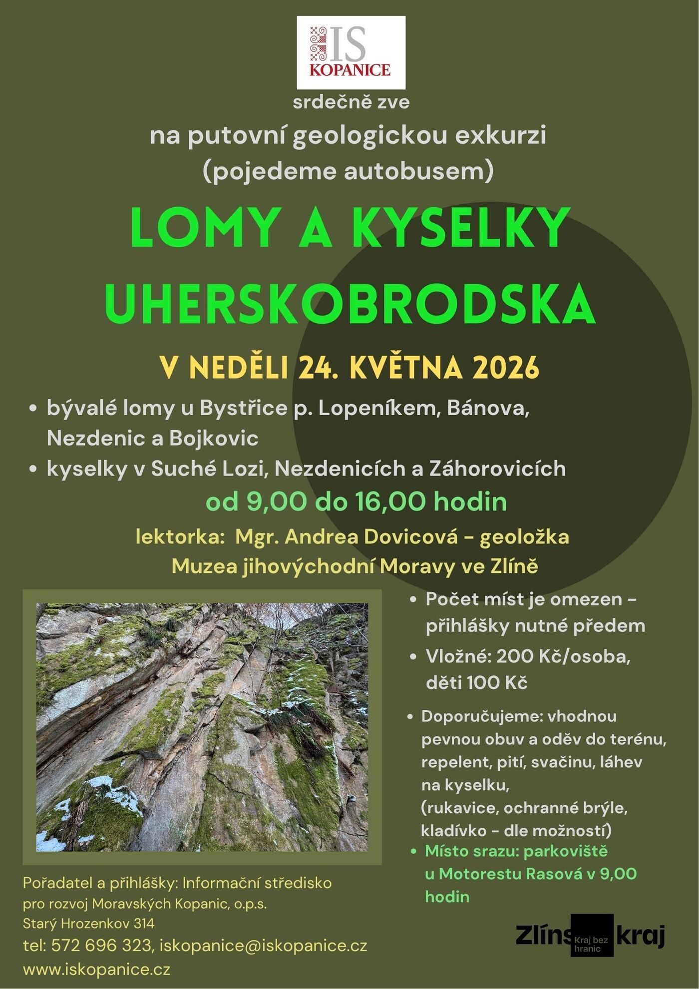 V rámci našeho geologického projektu, který realizujeme od loňska společně s Mgr. Andreou Dovicovou, geoložkou Muzea jihovýchodní Moravy ve Zlíně, jsme připravili další geologickou exkurzi – tentokrát putovní, autobusobou a vydáme se za lomy a kyselkami Uherskobrodska.