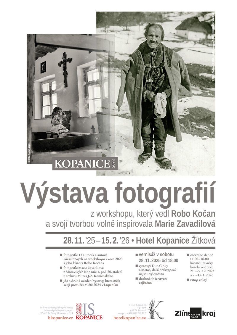 Vernisáž výstavy na Hotelu Kopanice proběhne v pátek 28. listopadu 2025 v 18,00 hodin. Hudební doprovod zajistí kopanické Duo Cinky a Metoš